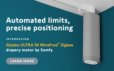Glydea®ULTRA 50 WireFree Zigbee Somfy introduces the next generation of drapery motors with the Glydea® ULTRA 50 WireFree Zigbee. This smart, powerful lithium-ion motor supports versatile mounting positions to fit several different drapery configurations. With Zigbee 3.0 technology, it seamlessly integrates with the TaHoma® switch, providing enhanced smart functionality for users and simplifying motor setup for installers.
