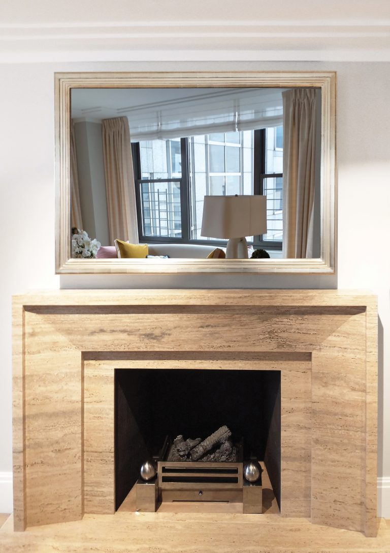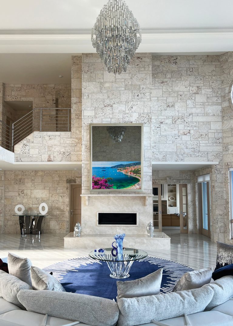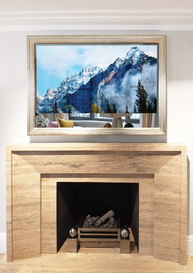 Another project we are excited to share is one of our Grand Portrait orientations with a beautiful 12 karat, white gold, hand-gilded and hand-carved wood frame. This is a case where the sound bar was put at the top side of the frame. This was installed in a large New Jersey home with cathedral ceilings on a textured stone wall above a mantle where a sound enhancement solution in the Mirror TV was necessary because they did not want in-wall or free standing speakers.