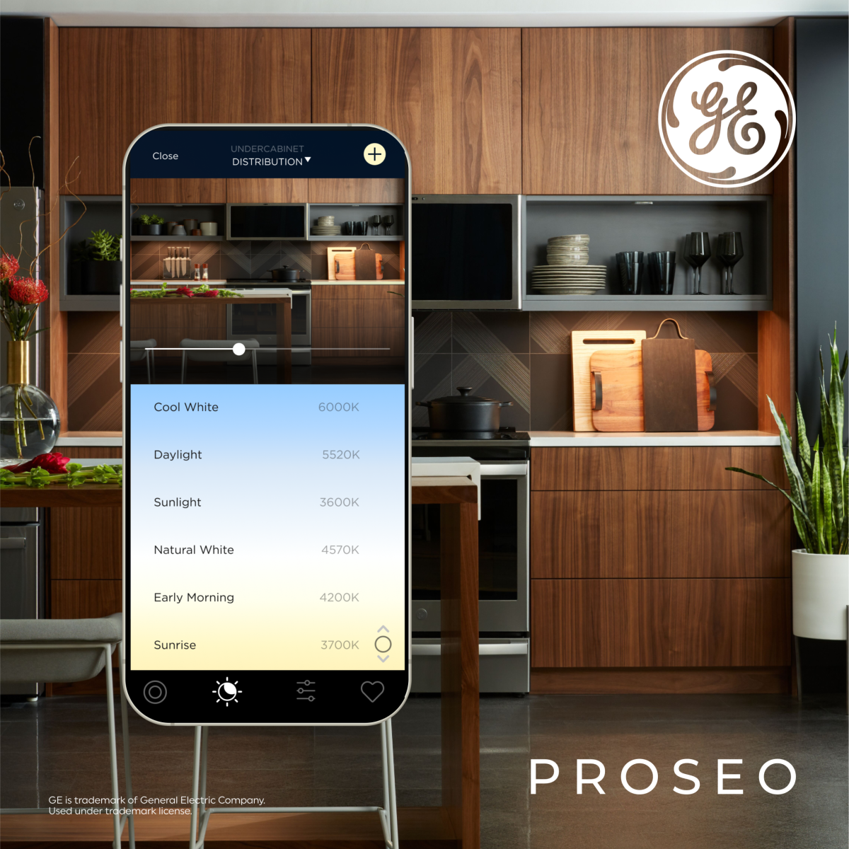 - GE Proseo Undercabinet Fixtures feature a slim, edge-lit profile and glare-reducing prismatic optics that evenly distribute light on the surface of any countertop without the glare or hot spots typical of most undercabinet or linear tape lighting. Dedicated undercabinet fixtures differentiate themselves by creating wide, even, uniform distribution.
