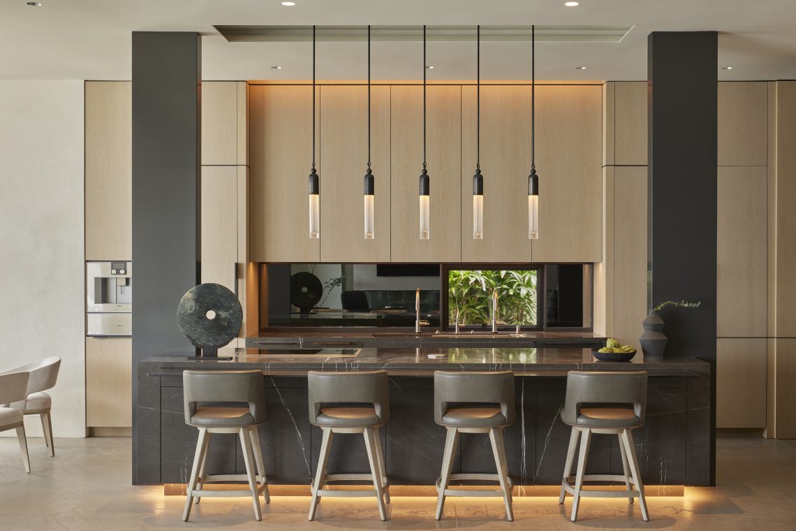 Lighting is more than functional here, it’s experiential. Every major space is layered with architectural lighting techniques that blend invisibly into the structure. Knife-edge LED coves trace ceilings and float wall panels to create ethereal glows and lift surfaces with precision, while chandeliers and mirrored accents in the entry dance with natural light to playfully “entertain the energy,” a nod to feng shui principles thoughtfully woven throughout the design. Vertical lighting features in the dining room symbolize tree trunks rising skyward, anchoring the space spiritually and visually