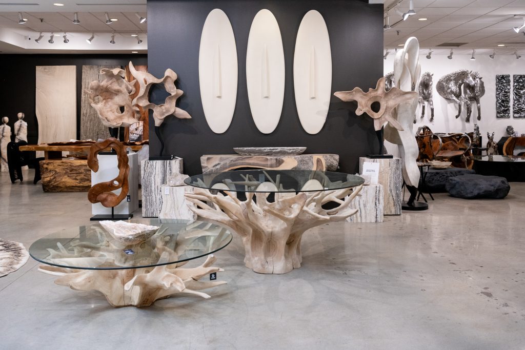 Their sustainability practices extend deeply into how they use wood. Phillips Collection is committed to getting the most material out of every tree they work with, starting from the roots. “If something has to be removed, we work closely with our team overseas to make sure we are maximizing what we can get out of it into functional product,” Jessica explained. “Where should we cut to get the most slabs? How many consoles can we get out of this? Can we make any debris from cuts into wall décor?”