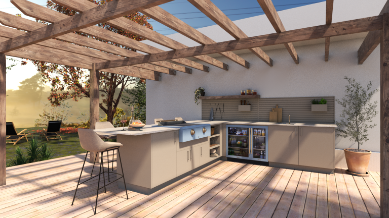 - Gather – Designed for connection and conviviality, the Gather pairs Urban Bonfire’s Clay finish with True Caliber’s Bluestone finish. The L-shaped layout places the cook at the heart of the experience, with open shelving, True Residential refrigeration, and a retractable sink supporting effortless cooking and entertaining. Every element encourages interaction and memorable moments outdoors.