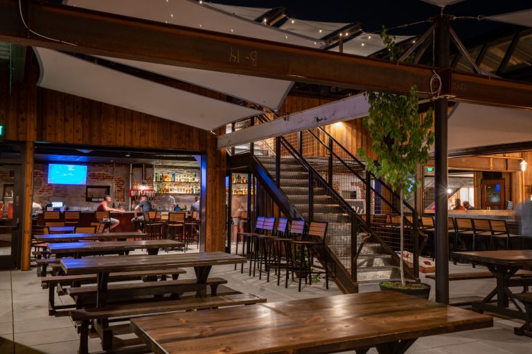 With the center of the space open three floors up and down, light and sound carry, filling space and bringing the vibe with them. The scorched posts and beams, steel and wood give the space a gritty authenticity that’s hard to fake.