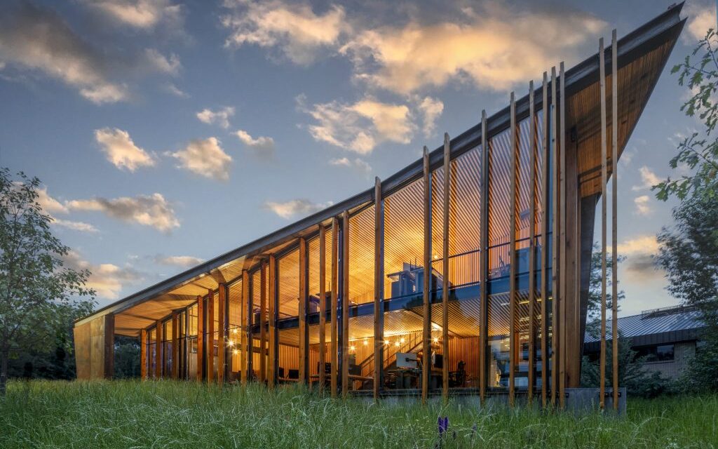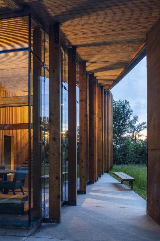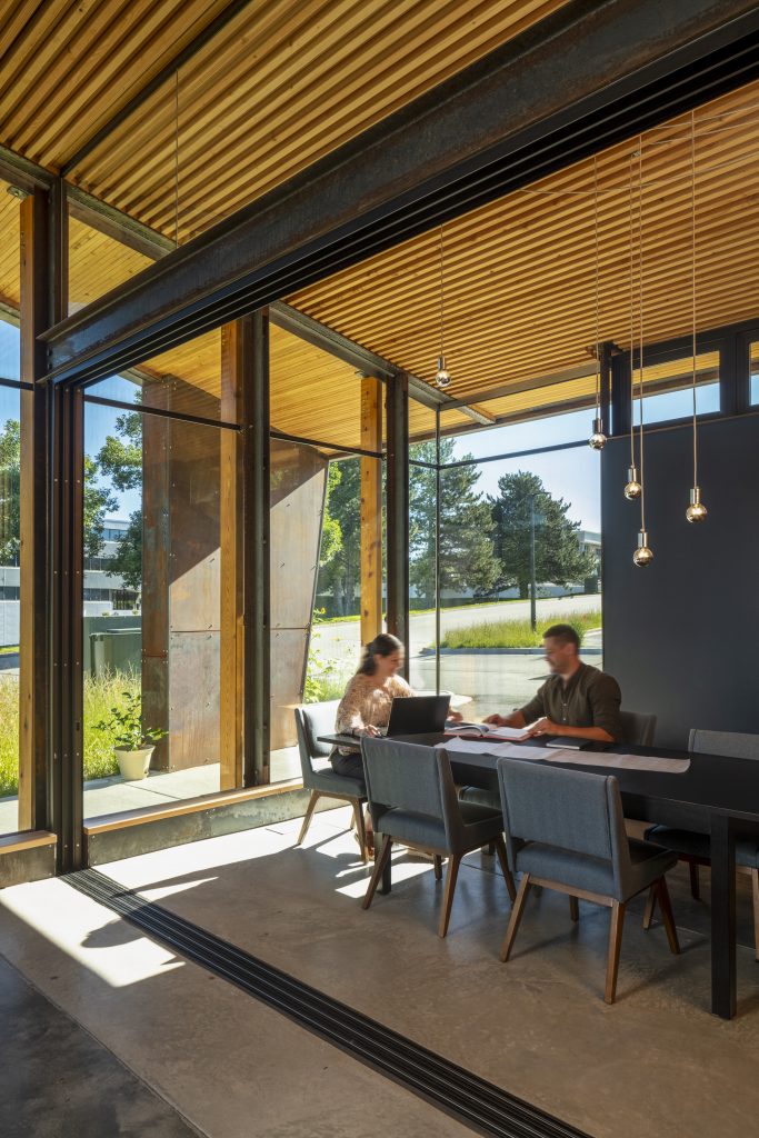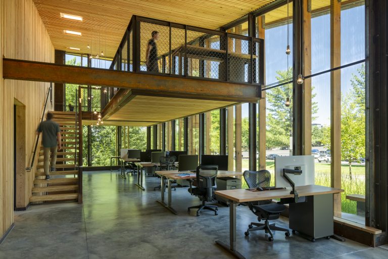One Line Studio’s award-winning office building exemplifies Politis’ penchant for human-centered design and biophilic embrace. Boasting an angled roof and a fully transparent north face, the studio looks more like a mountain town library than a commercial office building on the fringe of suburbia. Inside, the open daylit floor plan puts every employee on the glass. As designs make their way down the line, seasons change before their eyes.