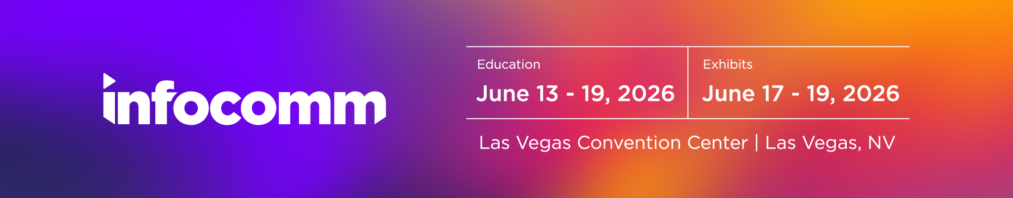 Infocomm 2026 banner with event details education june 1319 exhibits june 1719 held at las vegas convention center las vegas nv Features a vibrant purple orange and pink gradient background and highlights performance home innovations Infocomm 2026 banner with event details education june 1319 exhibits june 1719 held at las vegas convention center las vegas nv Features a vibrant purple orange and pink gradient background and highlights performance home innovations Infocomm® ic26