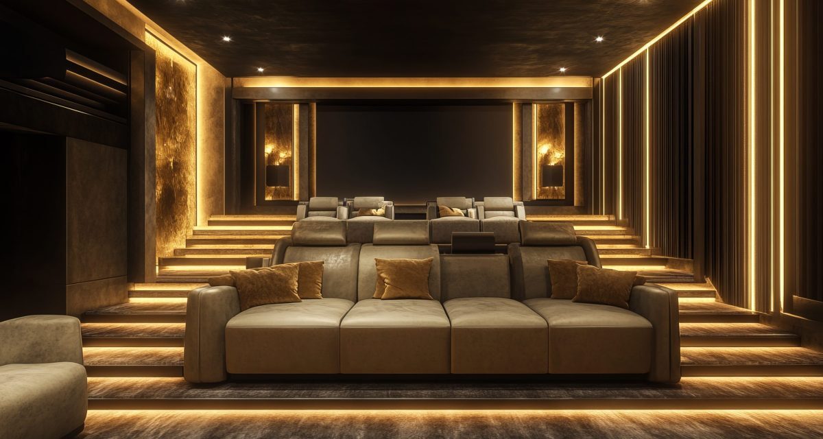 A plush home cinema with velvet tiered seating gold accents and a large projection screen ambient lighting and soundproof walls enhance the movie watching experience